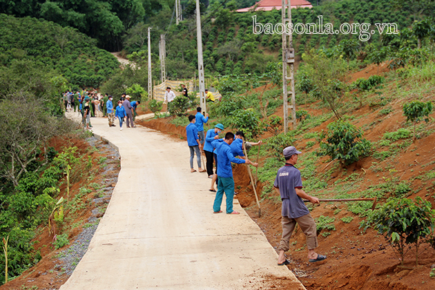 ĐVTN xã Chiềng Cọ cải tạo, bồi đắp đất đường trục bản và trồng hoa, cây xanh.
