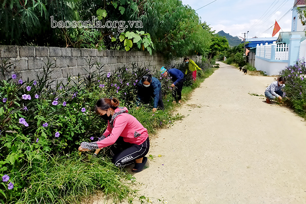 Hội viên Chi hội phụ nữ tiểu khu Tà Lọng, thị trấn Nông trường, Mộc Châu chăm sóc tuyến đường hoa.