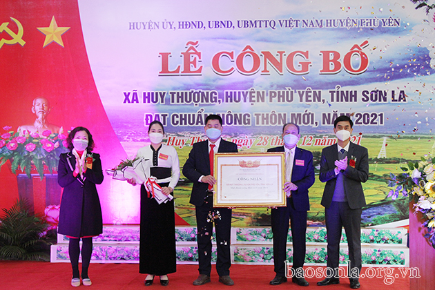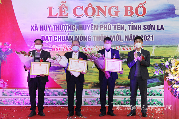 Lãnh đạo huyện Phù Yên chuyển trao Bằng công nhận xã đạt chuẩn nông thôn mới cho xã Huy Thượng.