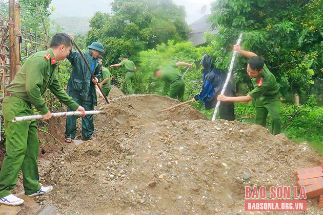Cán bộ, chiến sỹ Công an huyện Sông Mã giúp người dân bản Nà Cần 2 đổ bê tông tuyến đường vào bản.