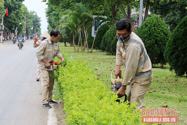 Công nhân Công ty Cổ phần Dịch vụ và Môi trường đô thị Sơn La Chi nhánh Quỳnh Nhai chỉnh trang khuôn viên