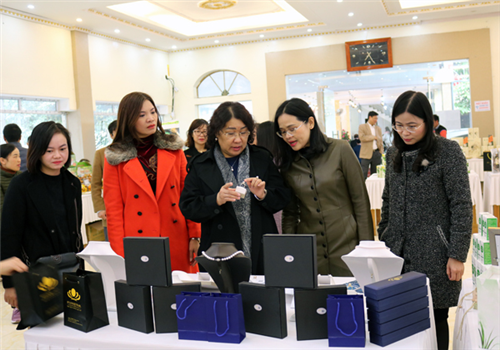 Các đại biểu tham quan gian hàng sản phẩm ngọc trai của Công ty TNHH một thành viên Queen Pearl Sơn La.